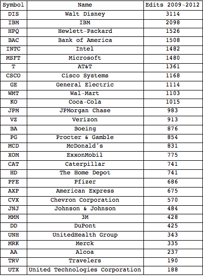 Well there are certainly some boring companies out there. In case you were wondering, UTX is an American multinational conglomerate that owns Pratt and Whitney (jet engines) and Otis (elevators) among others. TRV is a big insurance company, and AA produce aluminium. If I were being paid to do this I would probably want to look at each subsidiary of each of these mega-corps and check their wikipedia edit frequencies. However I’m not, so I won’t.