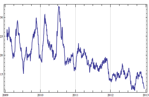 The more data there are to play with, the easier it will be to pull out trends. The Dow Jones Industrial Average has 30 of the largest US companies so they’ll do nicely.