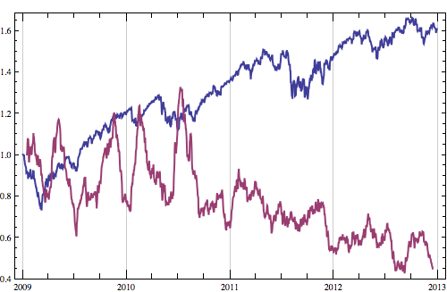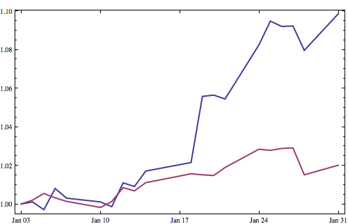 This happened on the 7th of January 2011. In the 20 days the NYSE was open in January 2011, IBM (blue) did this and the Dow Jones (purple) did this: