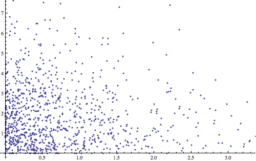 Above we have the DJI (blue) versus smoothed edits-per-day (purple). Let’s treat “normalised 31-day simple moving average of Dow Jones companies’ Wikipedia edits” as an index like any other, and see how the daily returns correlate with the Dow Jones itself. We’ll use the absolute (ie, not negative) daily returns for both because presumably Wikipedia edits are just as frantic for bad news as for good news.