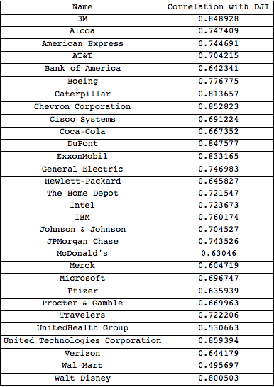One problem with looking at stocks is that they tend to move up and down with the market, regardless of the particular company the stock represents. The part of the stock that represents “the market” is called beta and the part that represents the “fortune” of the company itself is called Jensen’s alpha. We can see this is the case by checking the correlation of each of our 30 companies with the Dow Jones:
