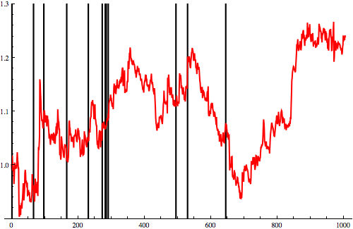 This chart shows DIS alpha in red. The black lines are days when Disney’s Wikipedia article had more than 14 edits. I might be going insane after spending too long thinking about Wikipedia article edit frequencies but I think some of them do seem to match with large up and down swings. Let’s see what this graph looks like with the second most frequently-edited stock, IBM: