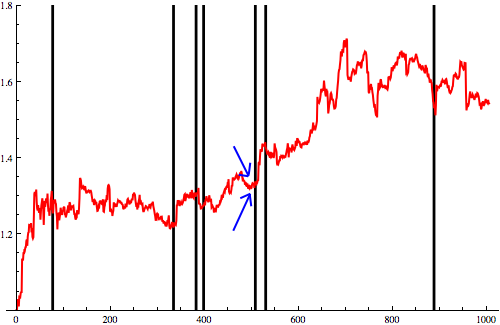 Oh woe is me! The predictive power I’d hoped for isn’t there. Edits didn’t spike until IBM hit bottom. In fact, looking through the Wikipedia history entries reveals the edits were all vandalism and the clearing up of vandalism. Perhaps one of the other spikes will reveal something more interesting. Let’s look at the following spike which I’ve marked with blue arrows on this chart: