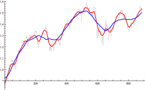 A common technical indicator you’ll find on sites such as Google Finance and Morning Star is the moving average. This represents the average value of the stock around a set period relative to a particular day. The following chart shows the world stock market (MSCI World) with the 120 day moving average (blue) and the 30 day moving average (red):
