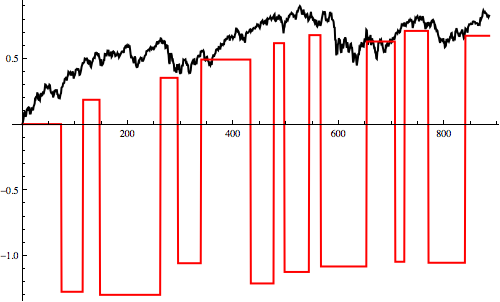 We can easily calculate the profit by calculating the difference of the signal with itself delayed one day. This produces a function that is 1 on buy days, -1 on sell days and 0 otherwise. Taking the product of this signal with the index price gives: