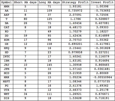 This tells us that using an 8/17 strategy, looking at the 8-day and 17-day moving averages, gave a return of 108% over the period compared to 8% for simply investing in MSFT directly. Lets look at some other stocks and see if we can find some strategies that consistently work. The Dow Jones Industrial Average currently has 23 stocks which have price information as far back as 2001: