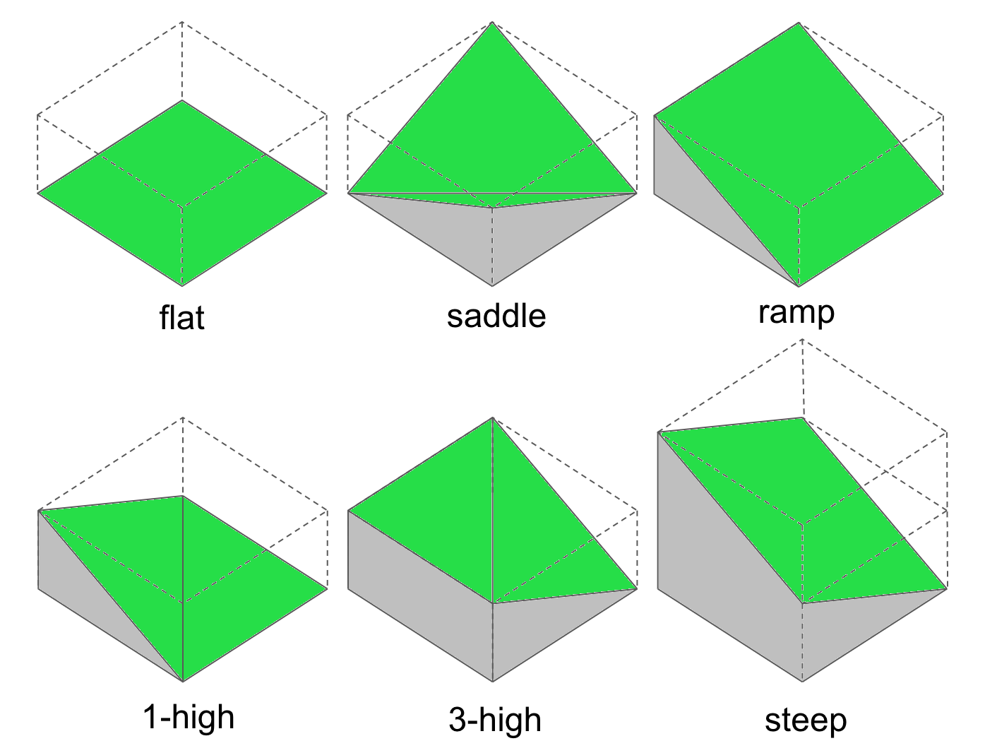 If we say that the lowest point of a tile is zero height, we can also define the tiles by the heights of their corners. For example we could refer to the flat tile as 0000, or a particular rotation of the ramp tile as 0110, or the steep tile as 1210
