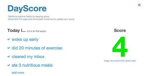 DayScore is basically XBox achievements for your life. You simply add a list of things you’d like to accomplish each day: go to the gym, smoke zero cigarettes, answer all your emails etc. Then at the end of the day you go to DayScore and tick the things you accomplished. DayScore rewards you with satisfying graphs (ooh look at those trends!) and big green numbers when you accomplish your daily goals.